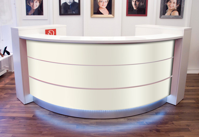 The round glossy counter is a piece of jewelery in your store. The bow form high glossy front is also available as all reception desks in more then 20 colors. Those exclusive desks are further enhanced by an indirect LED lighting in the front for a modern and timeless design. Please inquire for your own style reception desk and we can show you our capabilities.